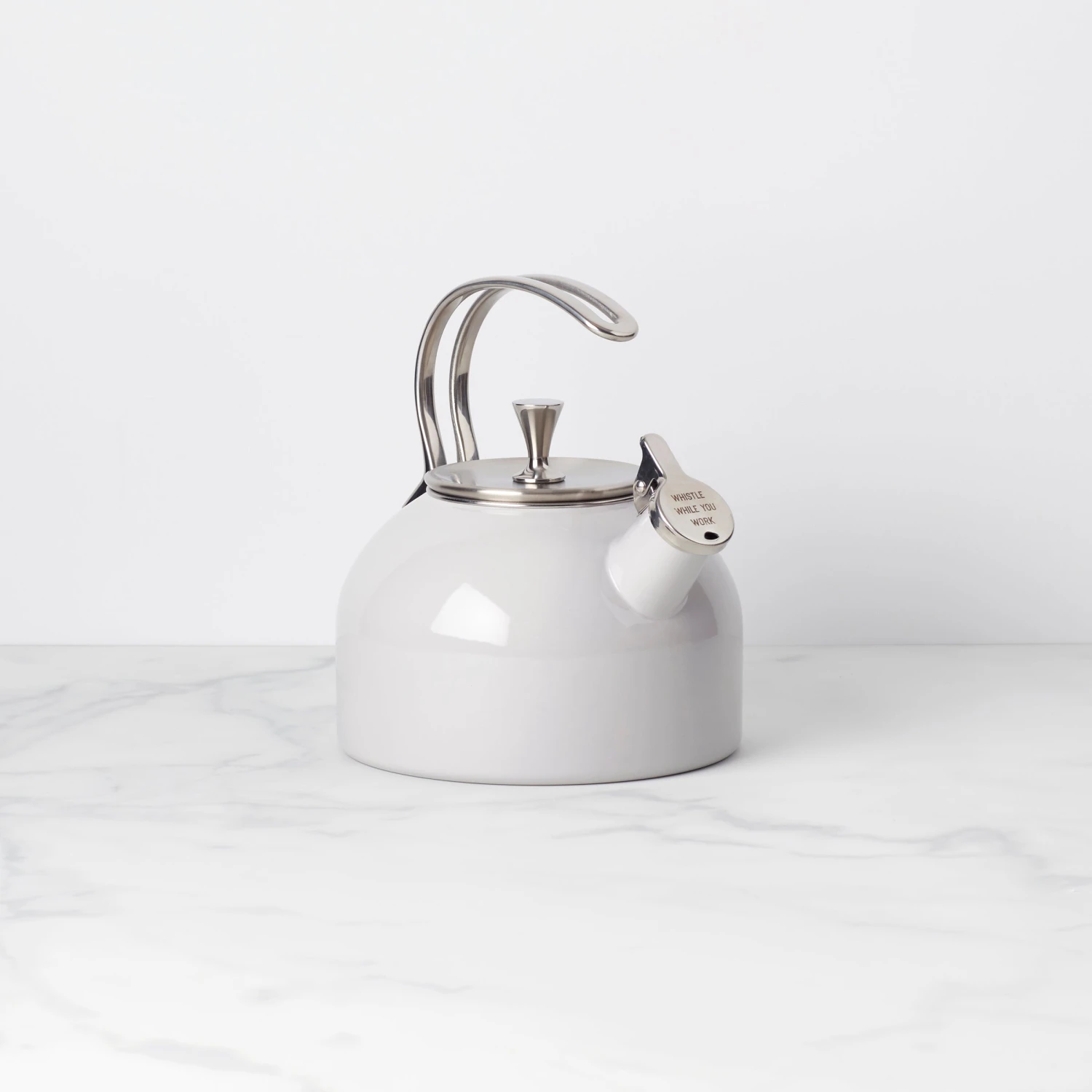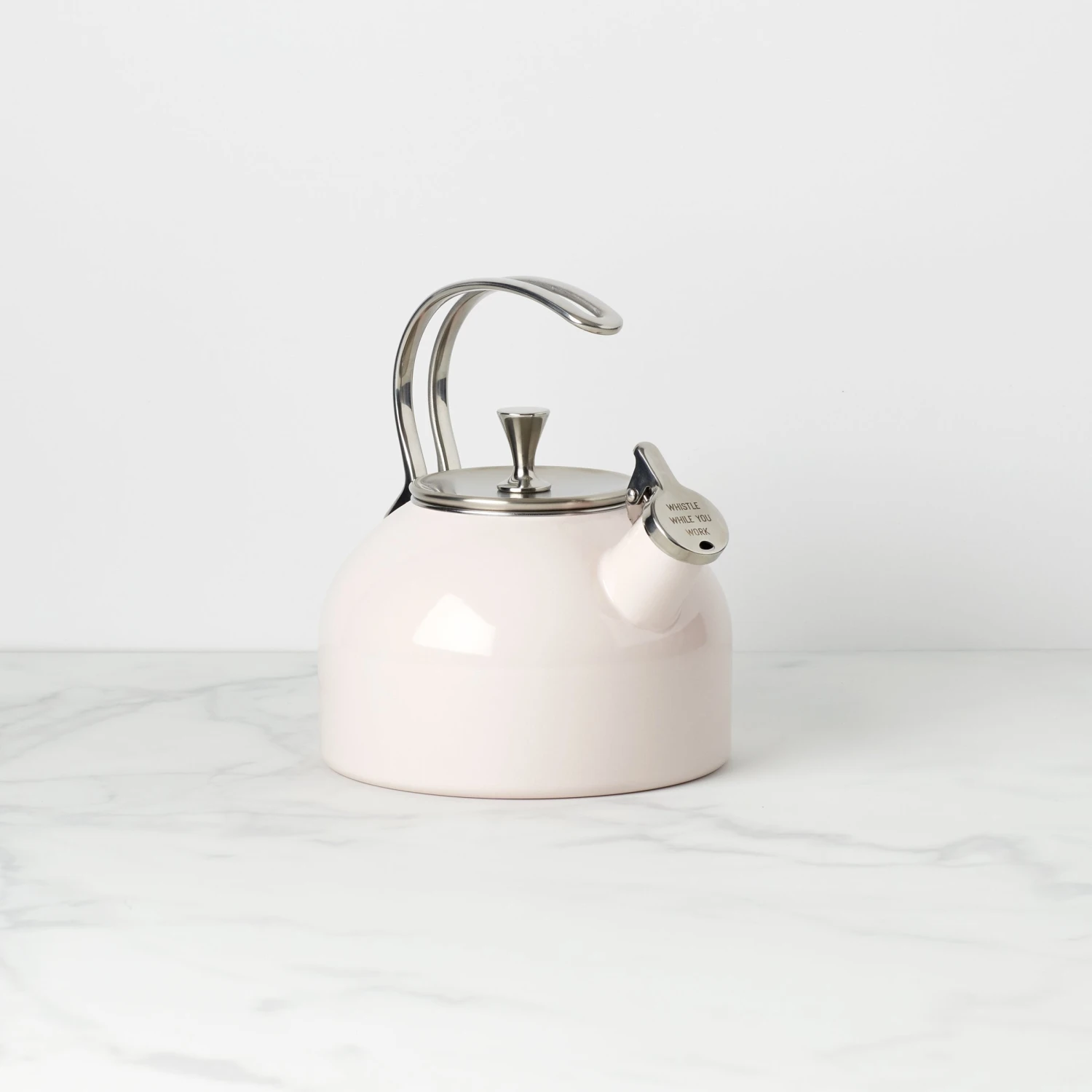 Sip and serve in style with this sleek tea kettle from Kate Spade New York. The polished enamel surface delivers a healthy dose of classic charm that you love. The bonus? It features a cute little “Whistle While You Work” message at the spout for a bit of cheeky fun.