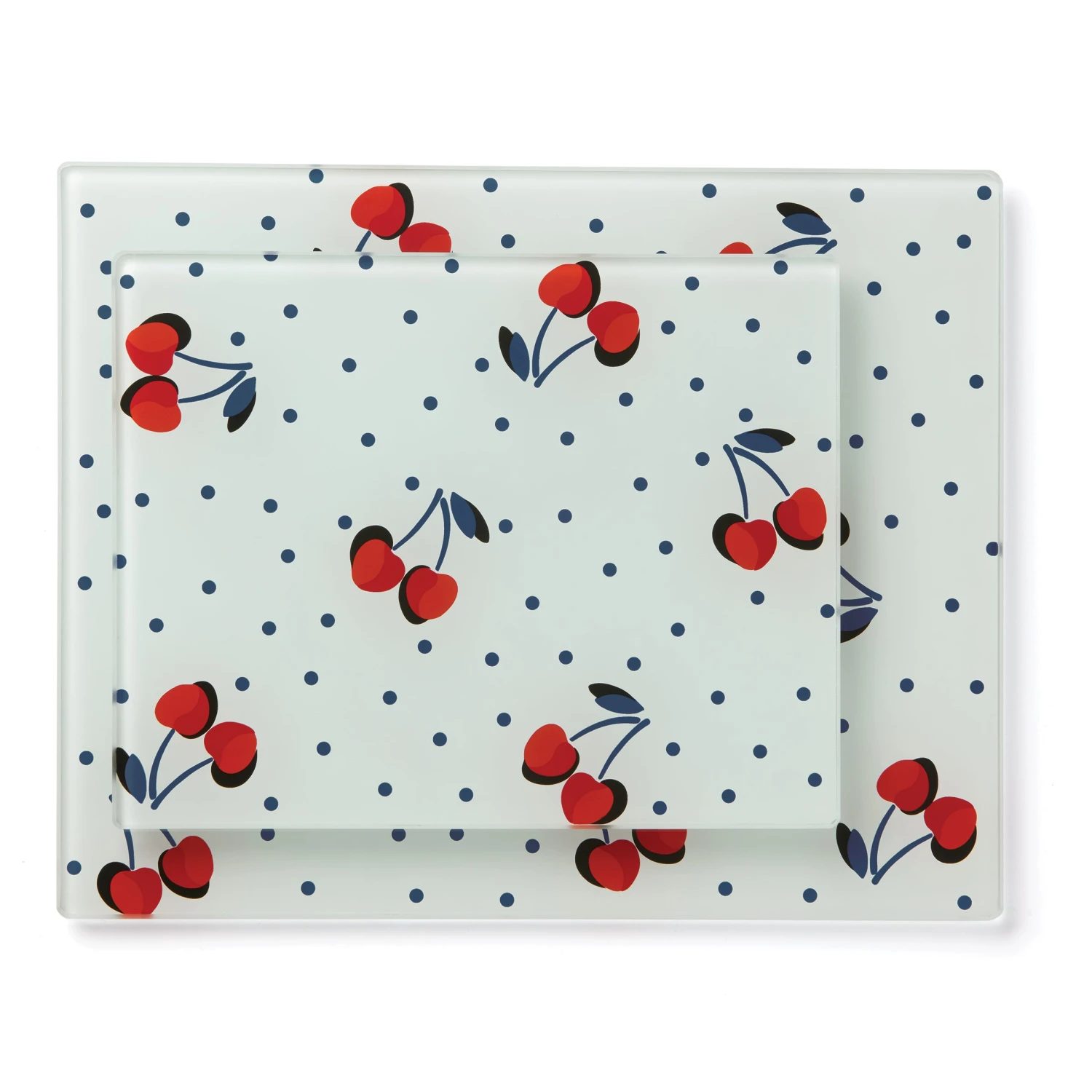 - The Kate Spade Vintage Cherry Dot 2-Piece Prep Board Set features a charming cherry dot design, adding a touch of elegance to your kitchen.