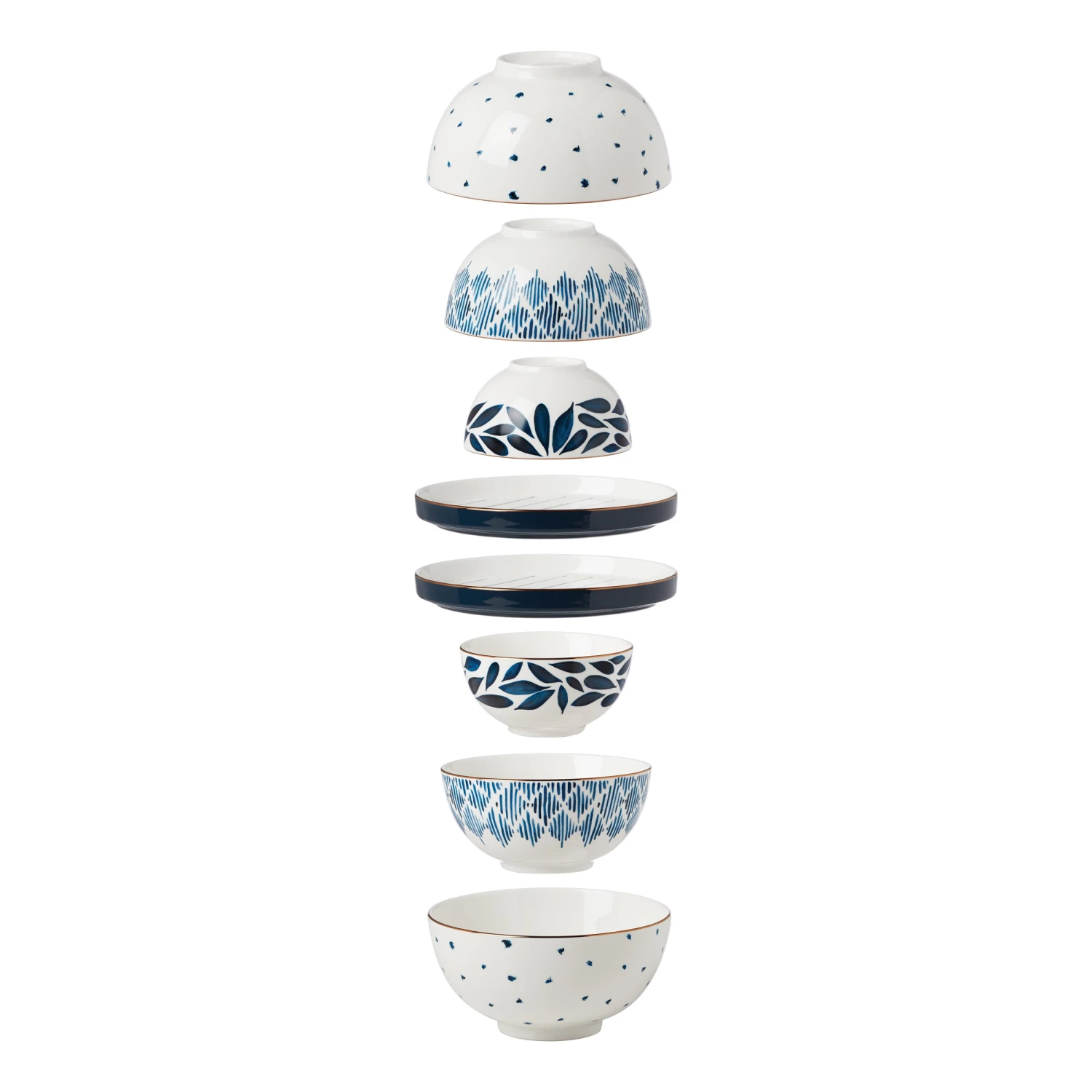 - The Lenox Blue Bay Luna 8-Piece Nesting Dinnerware Set features a stunning blue and white design, making it a perfect addition to any modern dining table.