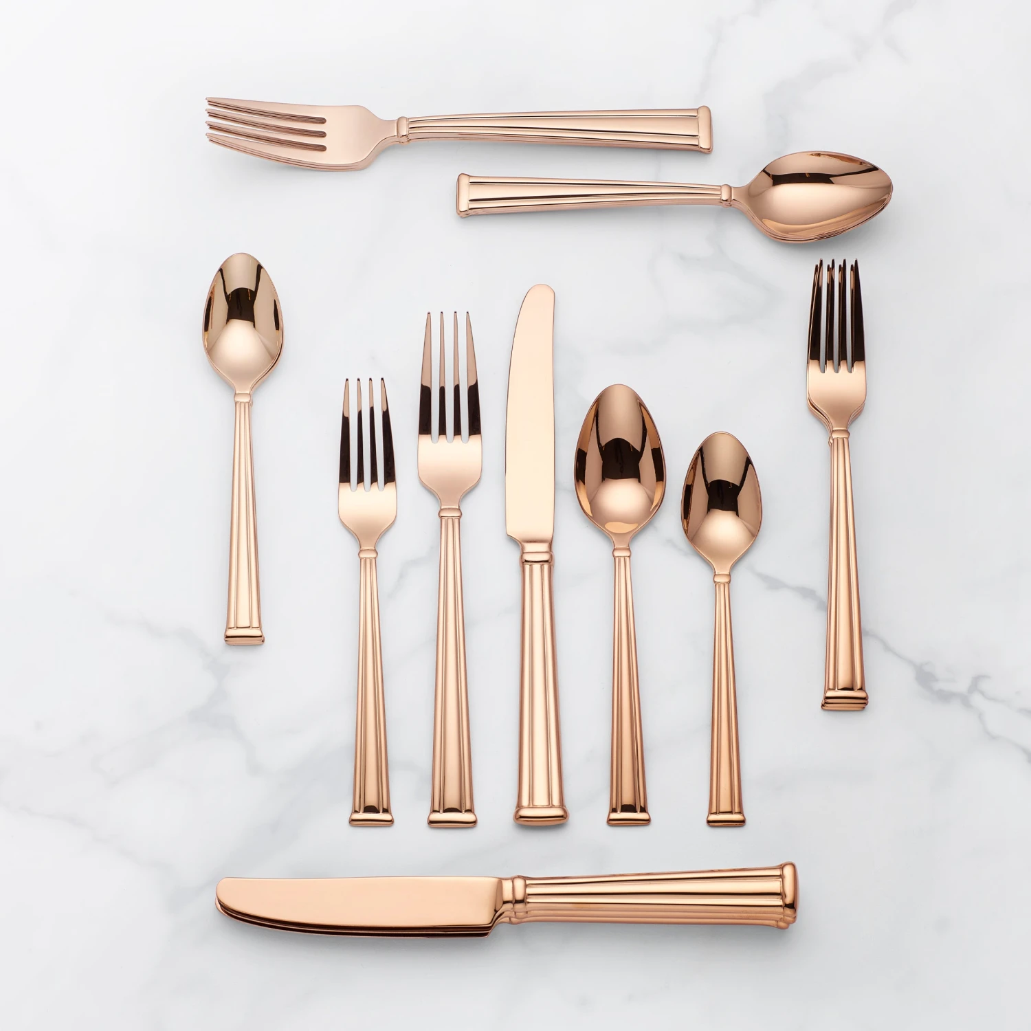 Slim lines create a visually pleasing column design along the handles of this 20-piece flatware set. Choose from three different types of metallic to match back to your dinnerware. Crafted of 18/10 stainless steel for durability and long-lasting rust resistance. The 20-piece set comes with four forks, four knives, four spoons, four salad forks and four teaspoons.